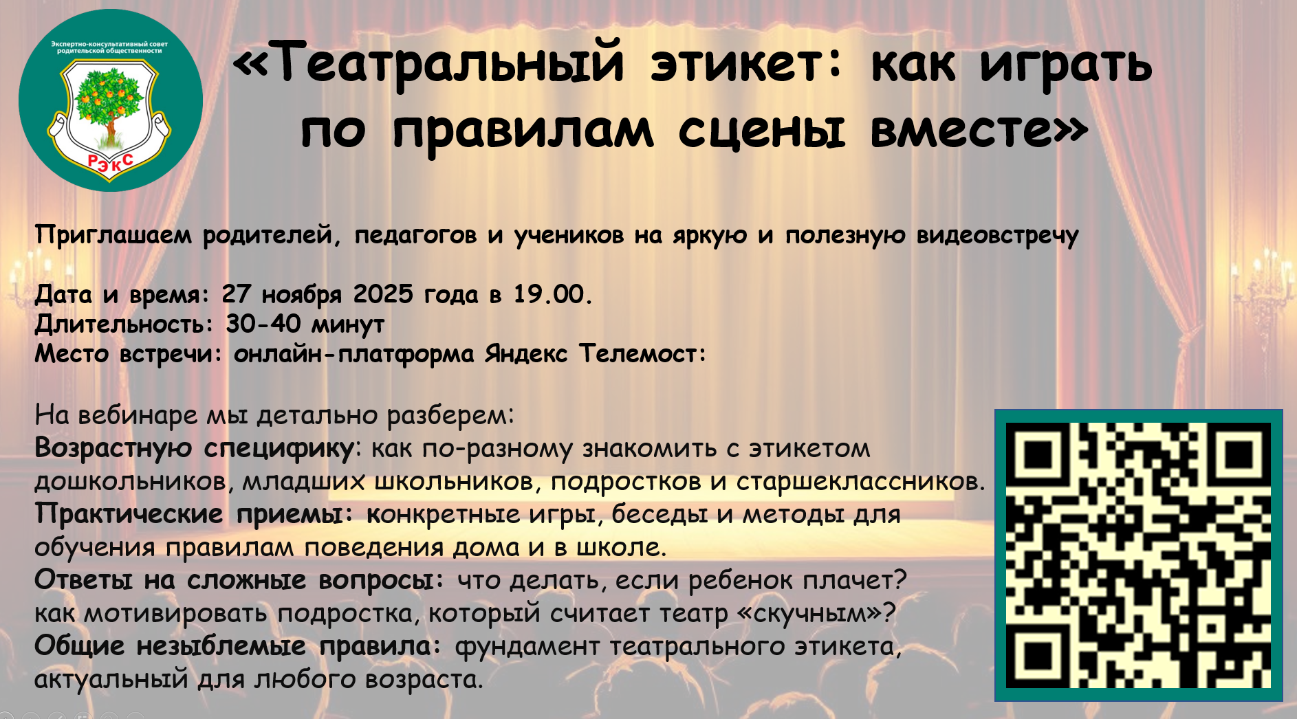 Видеовстреча для родителей педагогов и учеников "Театральный этикет: как играть по правилам сцены вместе?" 26.11.2025