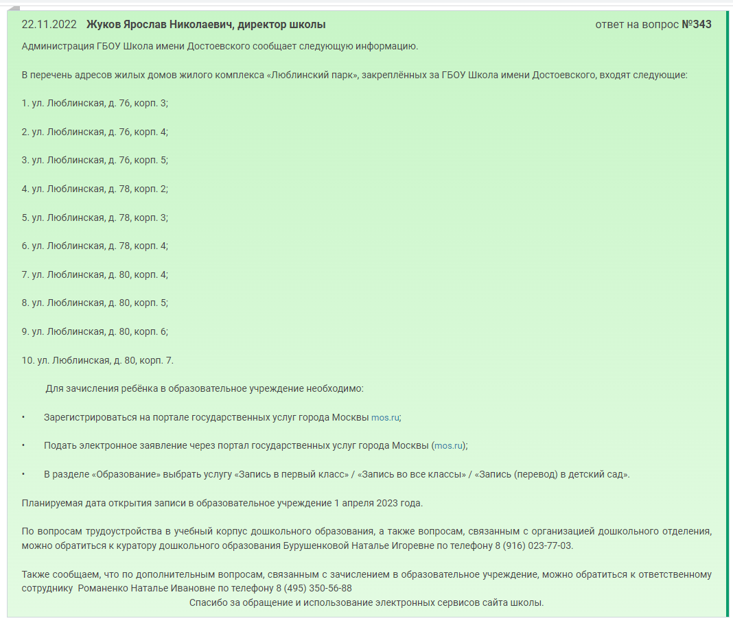 Администрация ГБОУ Школа имени Достоевского рассмотрела Ваш вопрос о перечне адресов, закреплённых за территорией ГБОУ Школа имени Достоевского.