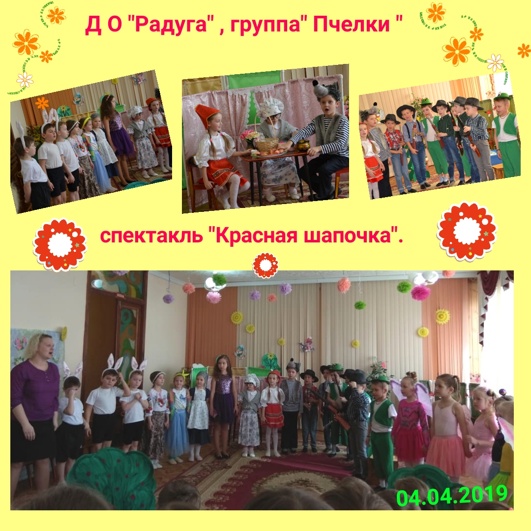04.04.2019 в ДО "Радуга" , состоялась премьера сказки "Красная шапочка", в которой актёры были воспитанники группы " ПЧЕЛКА". Актёрская игра была на высоте, не смотря на то, что играют дети. Постановка, костюмы, декорации, Звукорежиссерская работа была на профессиональном уровне. Ощущение было, что Мы побывали в проф. детском театре. Актёры играли свои роли и получали от этого наслаждение. Все зрители смотрели сказку с большим ИНТЕРЕСОМ. В конце спектакля, конечно были овации. Спектакль прошёл на одном ДЫХАНИИ.